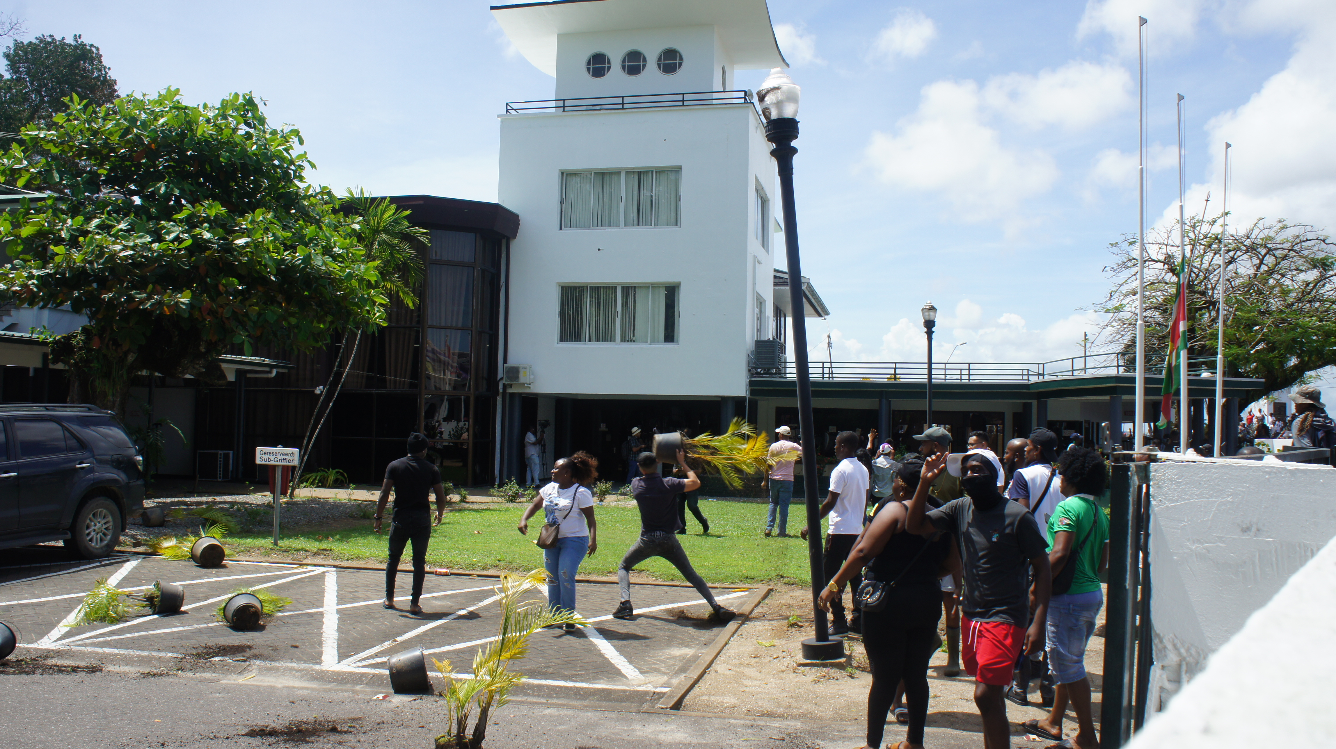 Ik filmde en ik zag. Hoe de ramen van het parlementsgebouw werden ingeslagen met stenen, de palmplanten op het parkeerterrein werden uitgetrokken, mensen over de muur klommen en een vrouw op eigen kracht een stalen hek uit haar voegen trok. Op het binnenplein van het parlement liepen mensen opgewonden door elkaar heen. Ze lachten, ze knuffelden, ze filmden, ze renden, ze zochten naar iets om mee te gooien, kapot te maken. De Surinaamse vlag hing halfstok (gisteren overleed een parlementariër), maar bleef onaangeroerd.